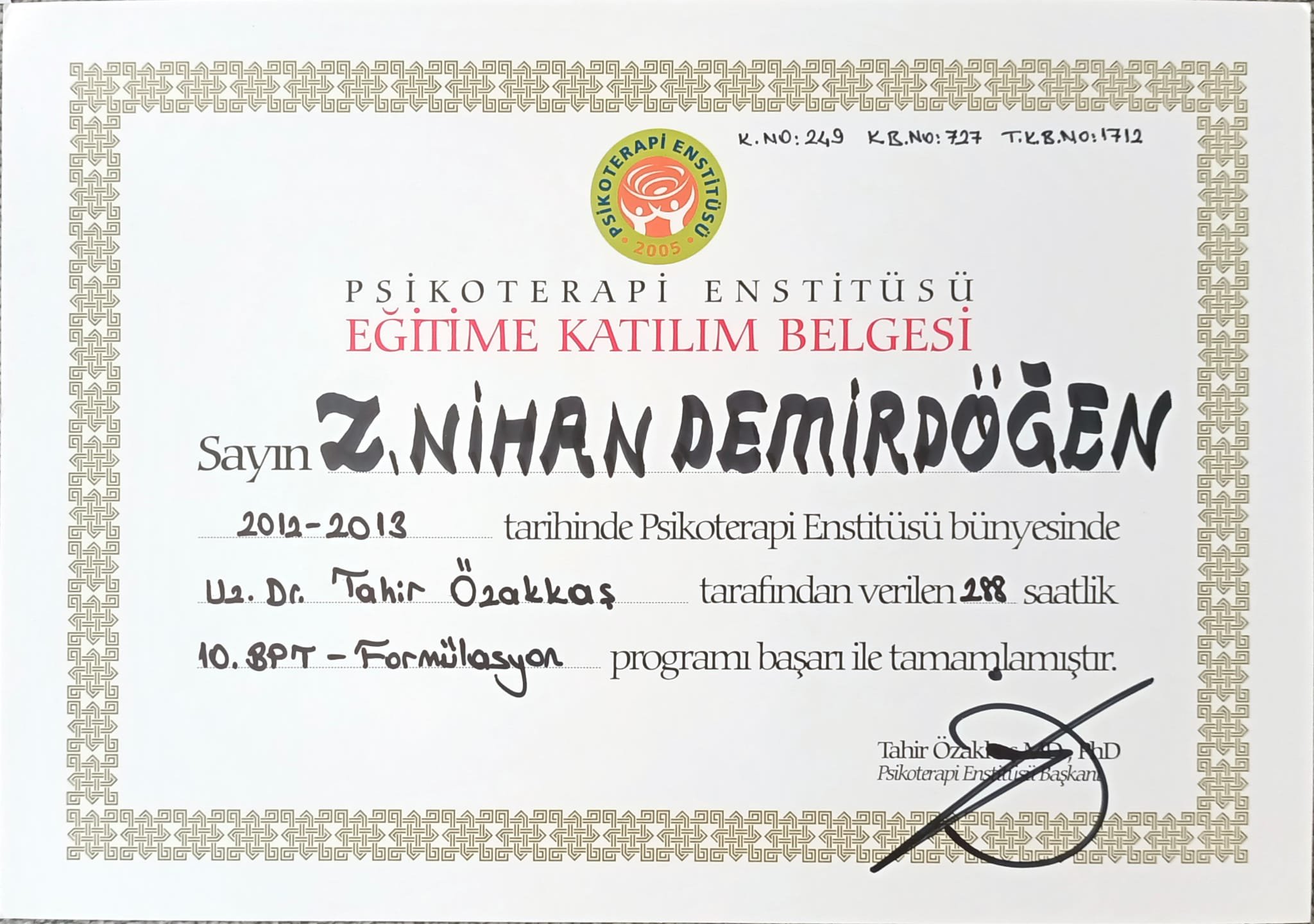 Psikoterapi Eğitim Katılım Belgesi